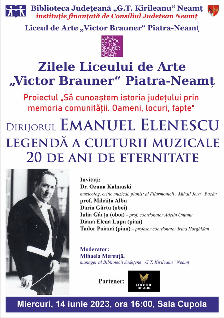Biblioteca Județeană „G.T. Kirileanu“ Neamț, în parteneriat cu Liceul de Arte „Victor Brauner“ Piatra-Neamț, organizează simpozionul „Dirijorul Emanuel Elenescu, legendă a culturii muzicale. 20 de ani de eternitate“, miercuri, 14 iunie 2023, cu începere de la ora 16:00, în Sala Cupola.
